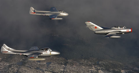This aircraft is a Polish-built SB Lim-2 (MiG-15UTI), produced by WSK-Mielec in 1952. The aircraft is operated by the Norwegian Air Force Historical Squadron as a representative of the Cold War ‘enemy’.